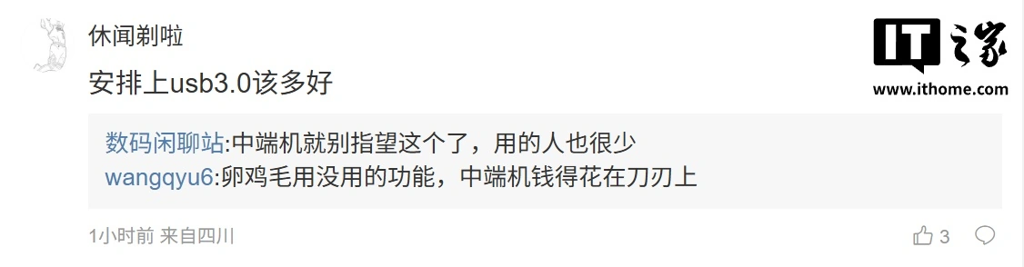 ”;另一名用户则回复道:“安排上 usb3.0 该多好”,博主则回复道:“中端机就别指望这个了,用的人也很少”。