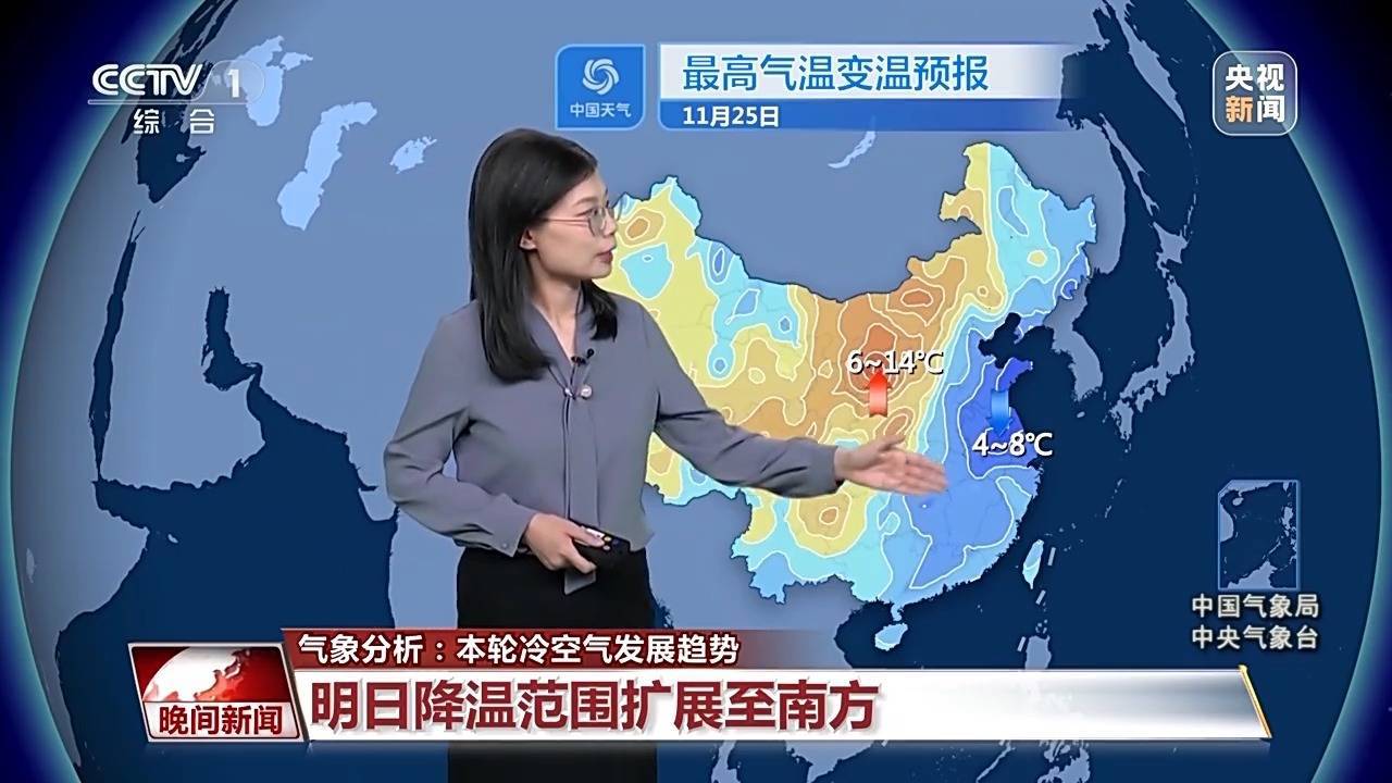 25日冷空气将快速东移南下,降温的范围也会向南扩展到南方大部地区,尤其是在山东、江苏、安徽一带,最高气温单日降幅可以达到4~8度。最高气温会降到常年正常水平附近,10度线会南压到黄淮,20度线会退至华南一带。