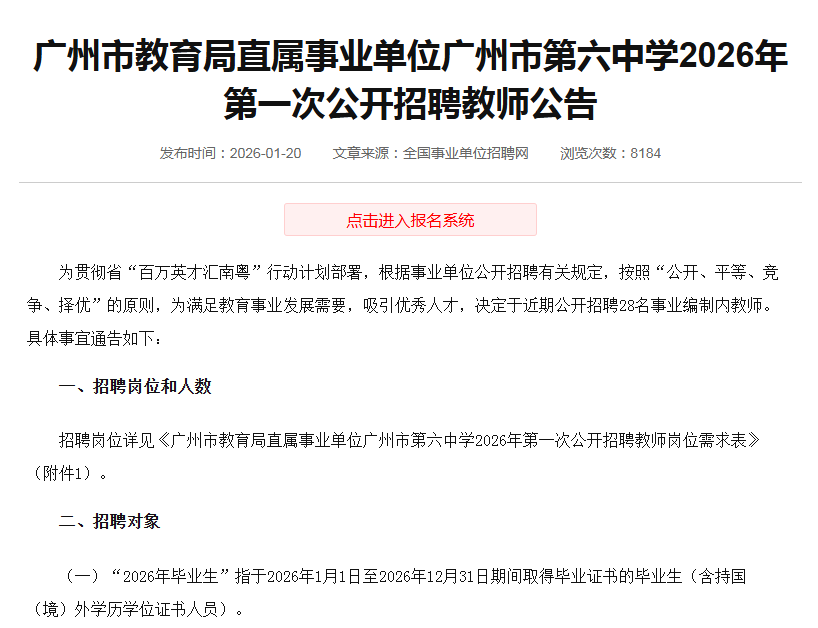 招聘岗位详见《广州市教育局直属事业单位广州市第六中学2026年第一次公开招聘教师岗位需求表》(完整表格见附件1)。