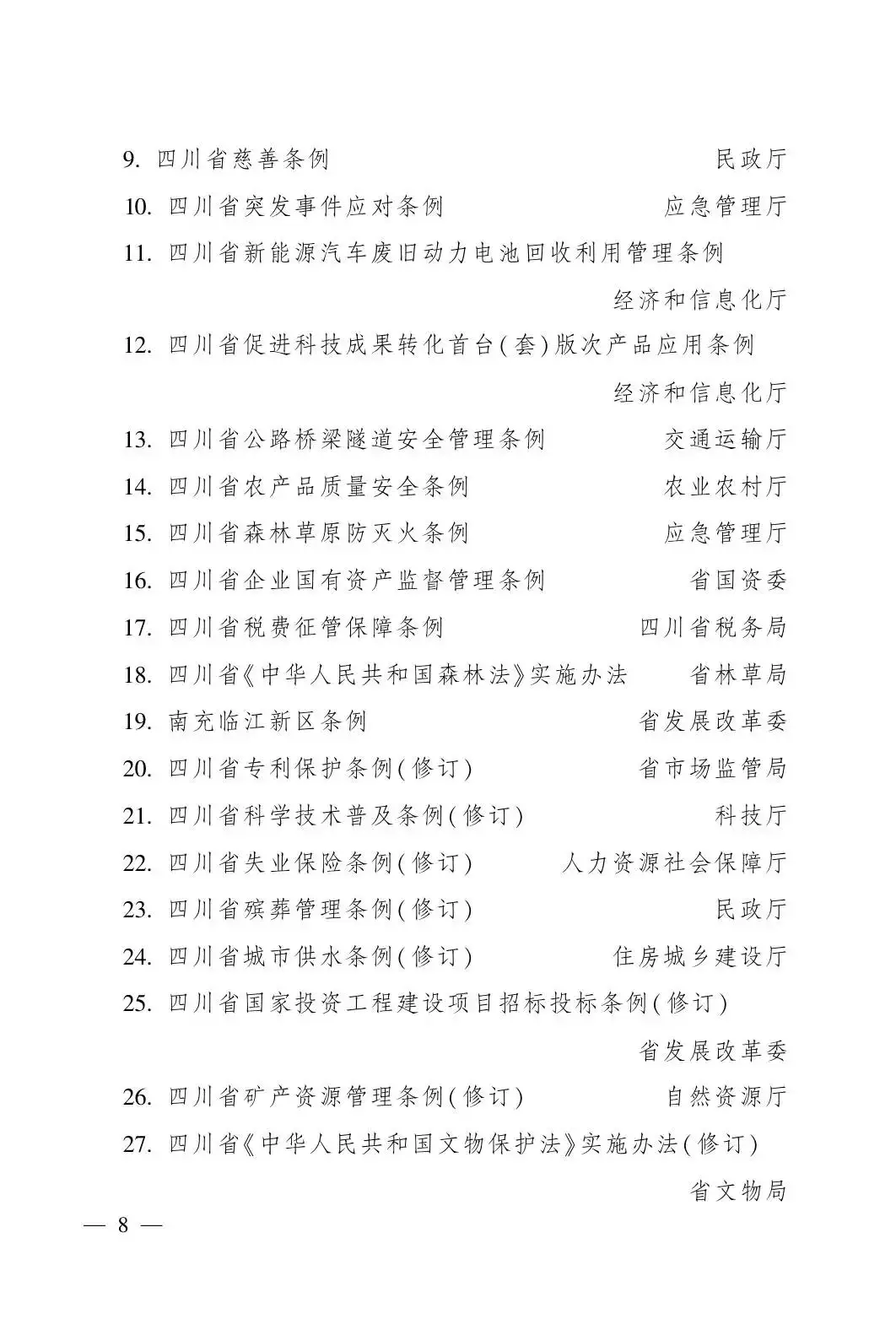 加快推进四川省城市更新条例、四川省慈善条例、四川省失业保险条例(修订)、四川省殡葬管理条例(修订)、四川省城市供水条例(修订)调研论证。