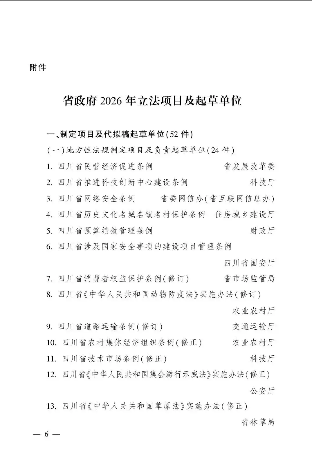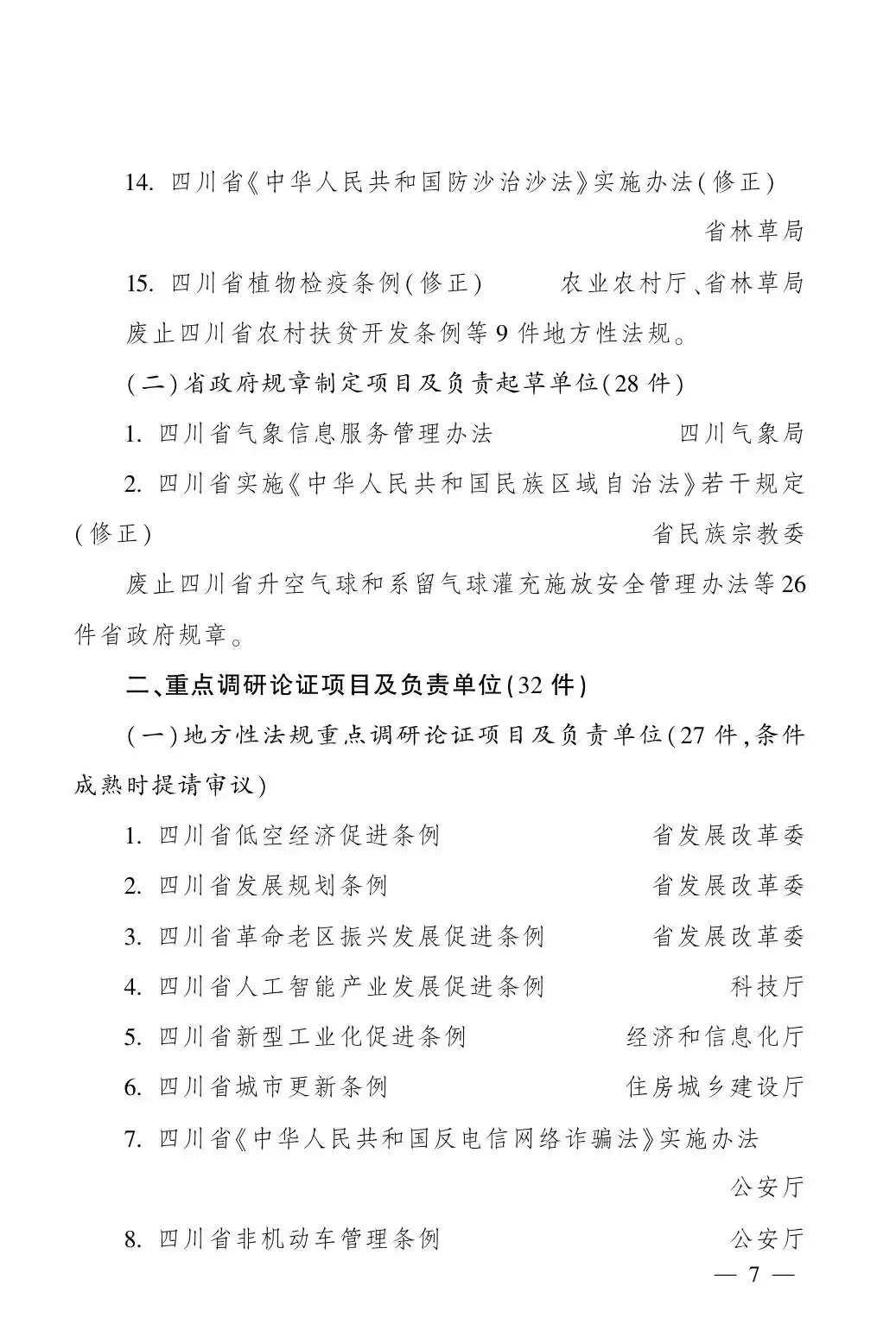 起草并提请省人大常委会审议四川省网络安全条例草案、四川省涉及国家安全事项的建设项目管理条例草案、四川省《中华人民共和国动物防疫法》实施办法(修订)草案、四川省《中华人民共和国集会游行示威法》实施办法(修正)草案、四川省植物检疫条例(修正)草案,加快推进四川省《中华人民共和国反电信网络诈骗法》实施办法、四川省非机动车管理条例、四川省突发事件应对条例、四川省公路桥梁隧道安全管理条例、四川省农产品质量安全条例、四川省企业国有资产监督管理条例、四川省110接处警工作规定、四川省气象灾害防御重点单位管理办法调研论证。